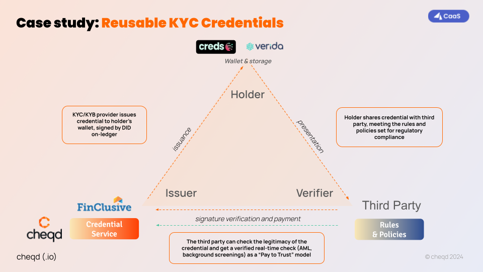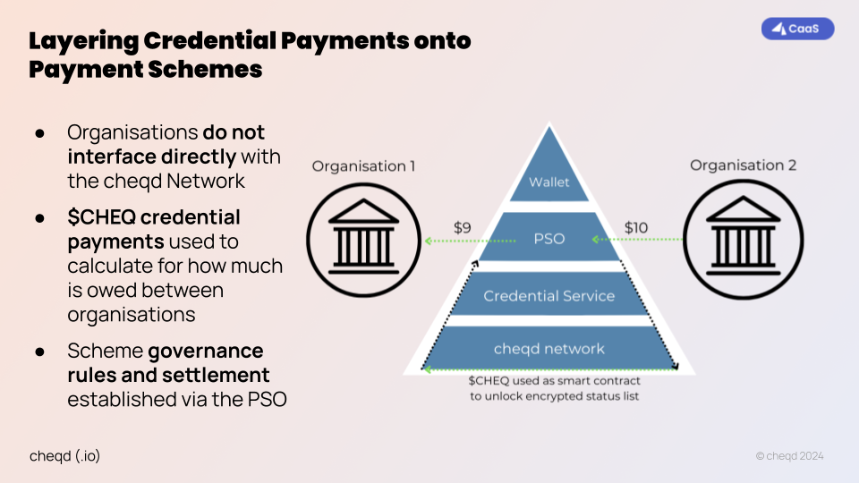 The latter half of 2023 saw considerable interest in how credential payments could serve large, regulated sectors, particularly in “regulated payment schemes“. We’re exploring innovative payment pathways through regulated intermediaries to mitigate risks and ensure compliance, alongside leveraging $CHEQ for on-ledger payments as a reliable settlement method in enterprise contexts.