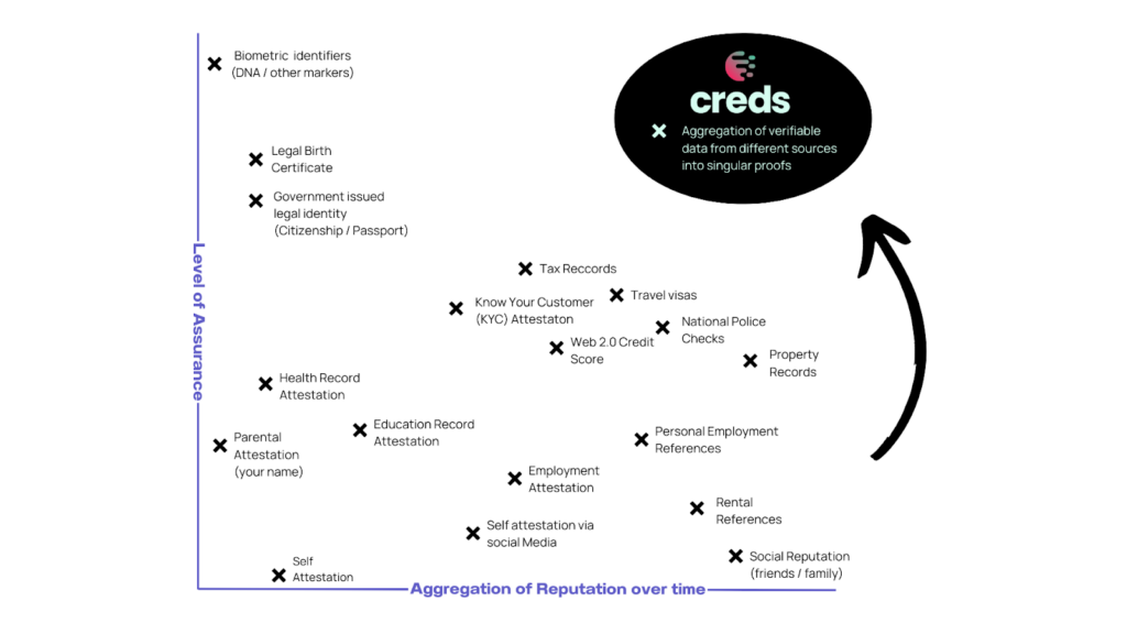 We go into detail later in this blog post on how our ambition is to allow credential holders (such as Creds.xyz Collectors) to aggregate all of their Web 2.0 and Web3 data in a single identity wallet, in their control. Once the data is in this wallet, we want to offer secure and flexible APIs in Creds.xyz that allow users to only reveal as much data as they want to and for developers to consume these APIs for privacy-preserving personalisation.
