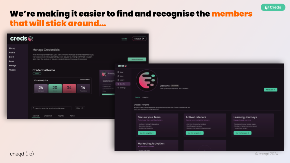 Addressing this, Creds.xyz will offer Creators customisable Quests and Campaigns, rewarding long-term engagement and allowing members to personalize their loyalty rewards. Tools like Galxe and Zealy incentivize engagement effectively, yet assessing community members’ commitment versus reward-chasing is challenging. Creds.xyz aims to differentiate by offering analytics & visualisation tools for Creators to gain insights into their audience, from demographics to preferences, while respecting privacy.