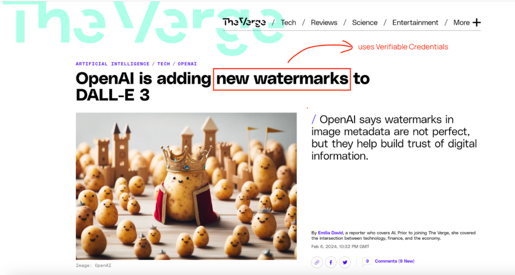 Digital credentials are already being used to combat this, such as Open AI adding verifiable “Content Credentials” to images generated by the DALL-E 3 model. We believe that Gen AI will become one of the largest real-world applications of Verifiable Credential technology, and with cheqd’s industry-leading decentralised ID features, we’re poised to capture a large portion of this emerging market.