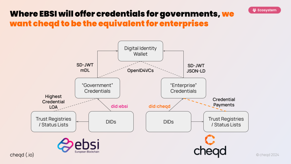 At cheqd, the eIDAS 2.0 amendment’s focus on Electronic Ledgers outlines our roadmap for adopting standards and protocols essential for EU-wide interoperability. In 2024, our goal is to fully support OpenID for Verifiable Credential (OIDC4VC) protocol and Selective Disclosure JWT credentials. This approach will allow credentials anchored on cheqd’s DID to be issued and verified through any EU-compliant digital identity wallet.