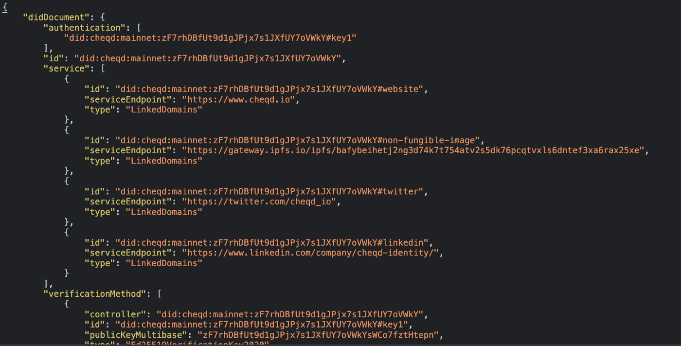 Over the last month, we have been working on adding support for the cheqd network driver to the Universal Resolver project. When you use this to access the DID Document for the DID we created, you will see: