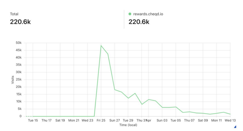 In terms of the frontend, we learnt that airdrop reward sites need to be more resilient to traffic spikes than most websites because, when announced, community members will tend to flock to the site to claim their rewards generating a large spike in traffic, followed by a period of much lower traffic.