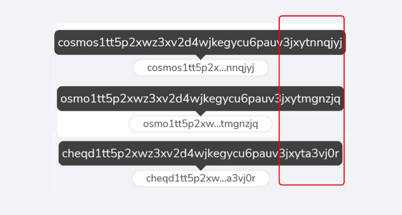 There is an assumption in the CosmosEcosystem that wallet addresses across different chains, such as, Cosmos (ATOM), Osmosis (OSMO) and cheqd (CHEQ), are all identical. This is because they all look very similar. However, each chain’s wallet address is actually unique.