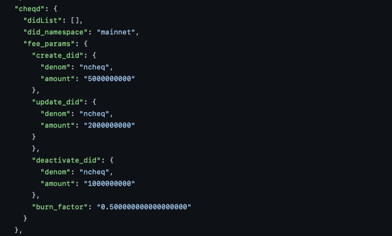 As can be seen in the image above showing the genesis parameters which define the costs in $CHEQ, there is also a “burn_factor” variable which sets the percentage of the tokens charged for identity transactions which will be directly burnt. This can be adjusted through on-ledger governance votes according to the cheqd community preferences.