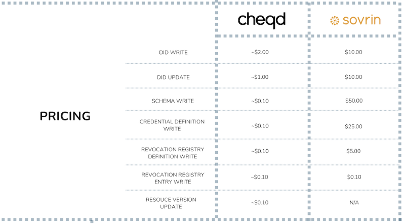 Currently (prior to the proposed update), writing a DID to cheqd mainnet only costs gas, which is approximately 0.004 $CHEQ. This is extremely cheap when compared to networks such as Sovrin, where writing a DID costs $10, especially taking into account the value we are bringing as a network, protocol and team.