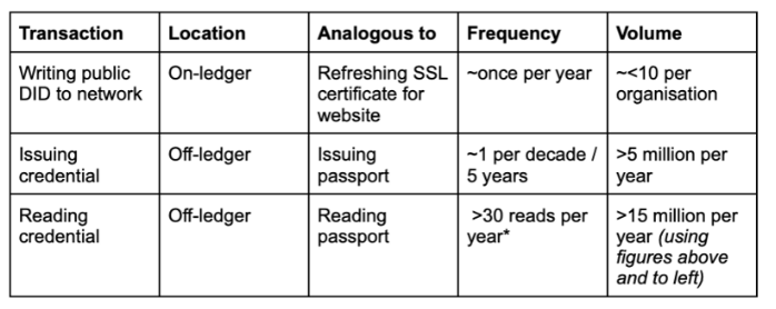 Repeating a table we included in Tokenomics part 3 below, issuing credentials and hence interacting with revocation registries is significantly higher than DID transactions.