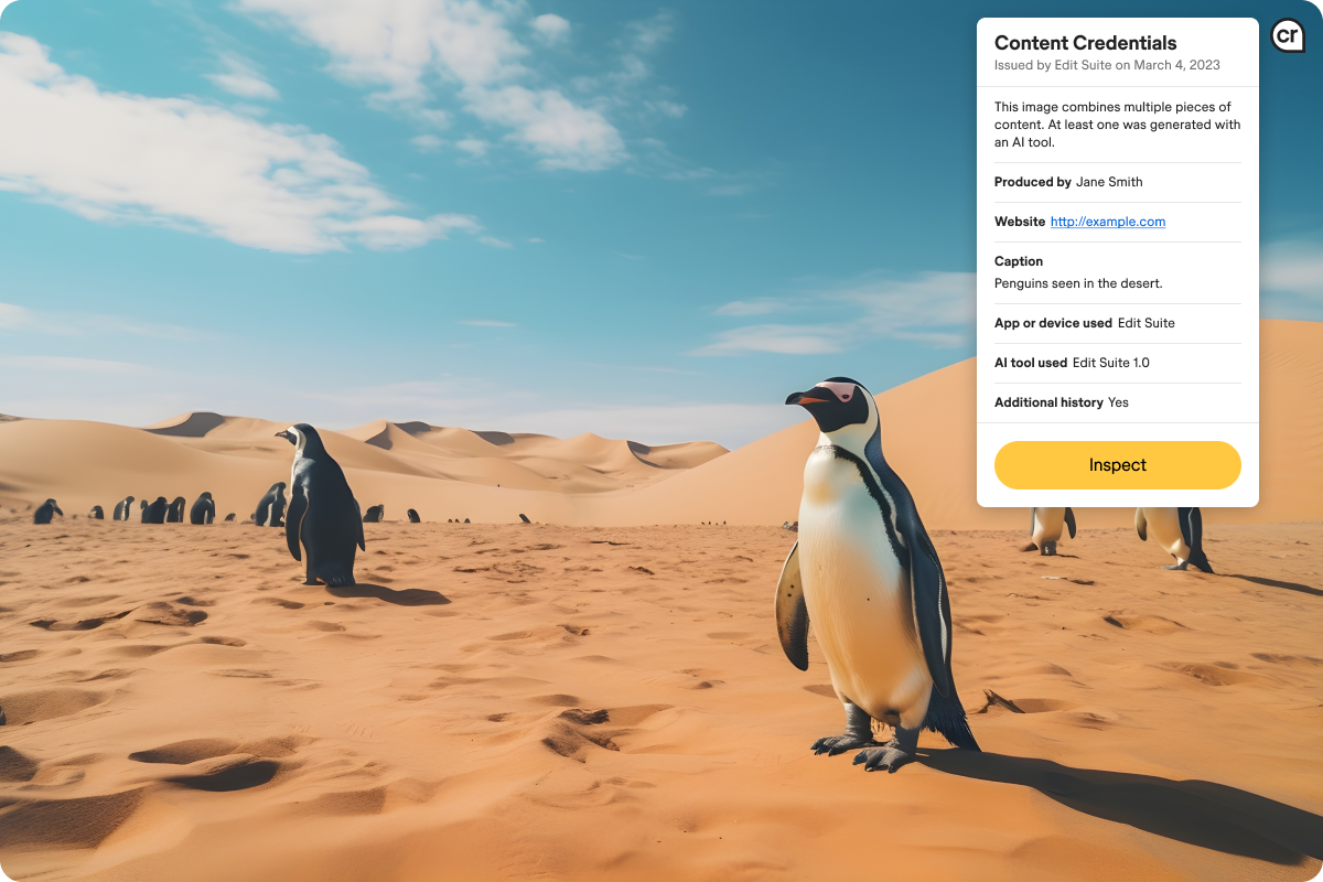 - Publishers looking to use an image for a news article check the content credentials to ensure the image is genuine before purchasing the rights to use the image