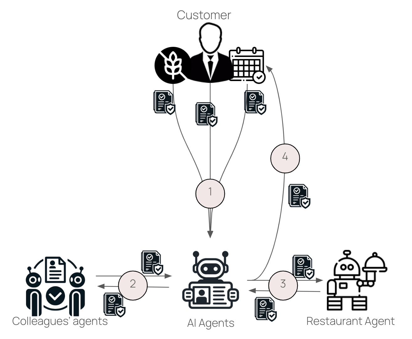 - A customer wishes to book the time of a business dinner at an uptown restaurant. He signs verifiable credentials (VCs) giving his AI agent permission to book calendar events for him and to represent him in certain interactions, as well as giving the agent permission to share his dietary restrictions with other agents.