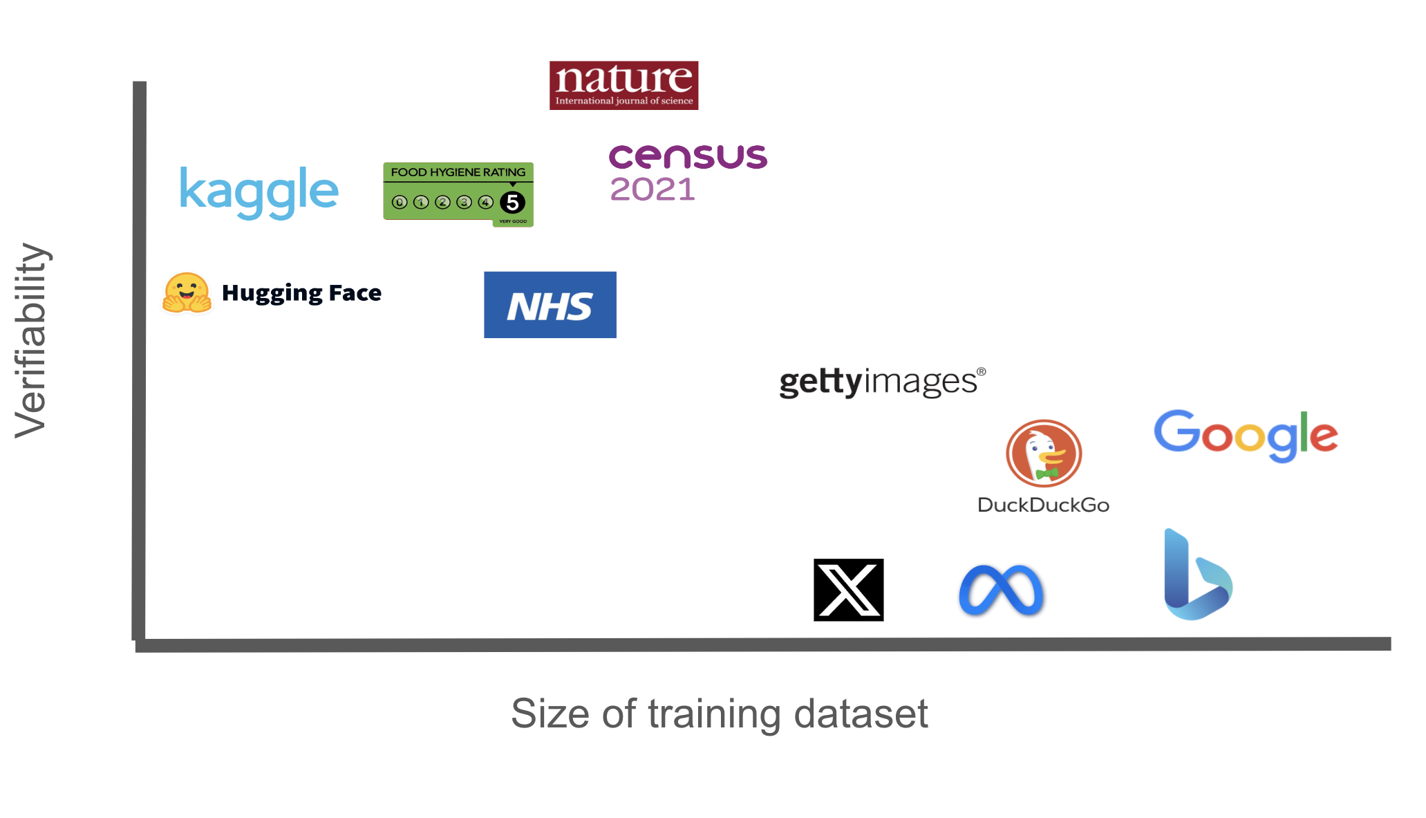 Small datasets present an early low-hanging fruit for Verifiable AI. Specific datasets for niche subjects require subject matter experts and other ‘trust anchors’ to vouch for the quality of the data contained within and their smaller size means these datasets are more likely to be found on the kind of decentralised marketplaces those working in the ‘Decentralised AI’ space would prefer to use. Current data marketplaces such as Kaggle and Hugging face are highly centralised sites in which social proof through a system of reddit-like up-and down-votes is used to establish ‘quality’ – a measure that is highly manipulable.
