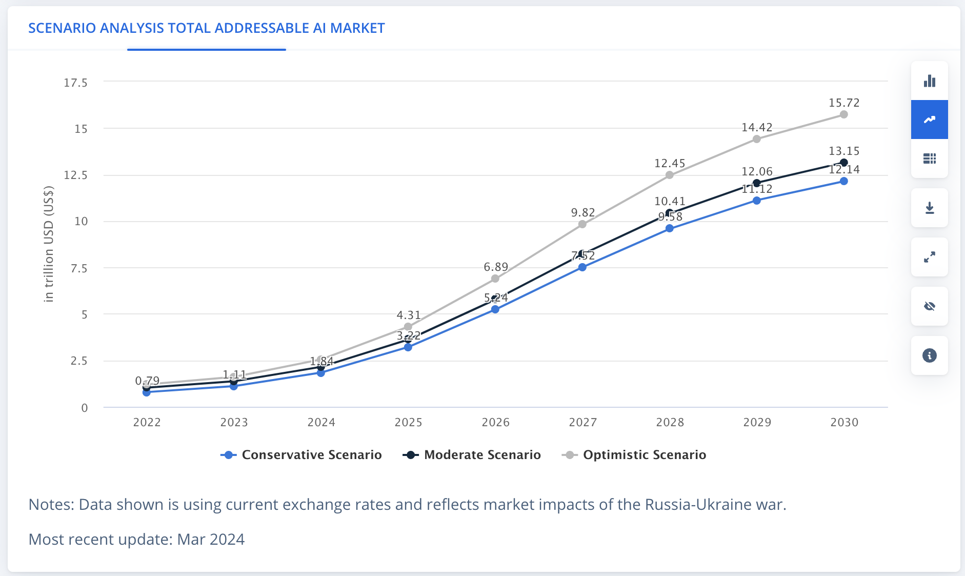 Artificial Intelligence is widely viewed as a huge driver of growth over the coming decade, with statista reporting that the total addressable market size by 2030 could reach 15.72 trillion dollars. For comparison, that would be the same as doubling the EU’s total GDP, which is roughly 16 trillion dollars.