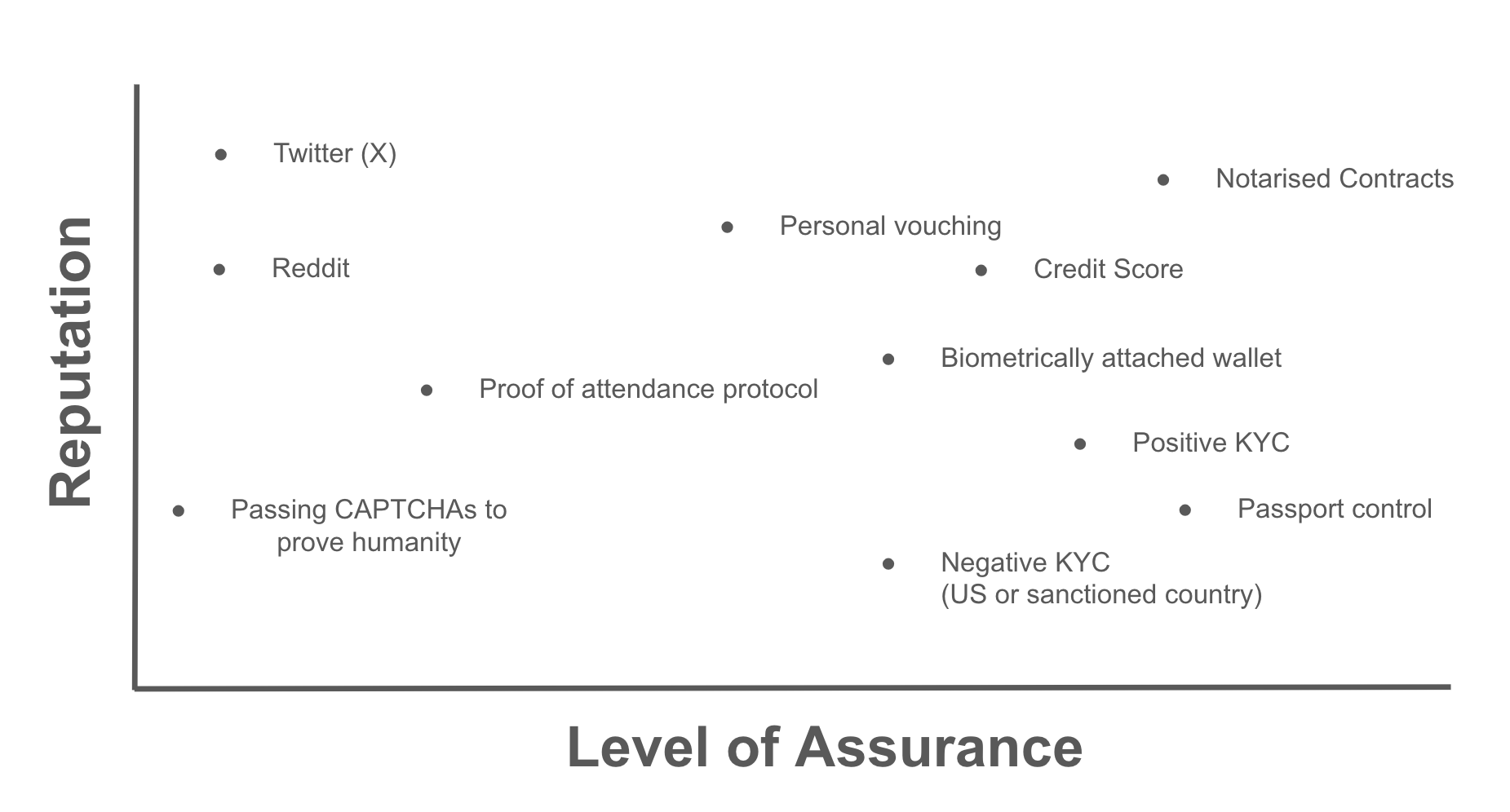Low assurance proof-of-personhood would be methods such as using a CAPTCHA, whilst a site such as X requires only an email address to create an account (hence the deluge of bots). A site like X however, largely uses follower count, reputation and proof-of-payment (X verified) to define who is worth listening to or not – one’s reputation is somewhat divorced from the assurance that one is who they say they are.