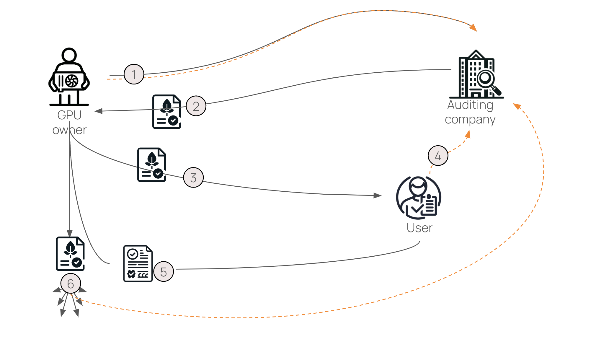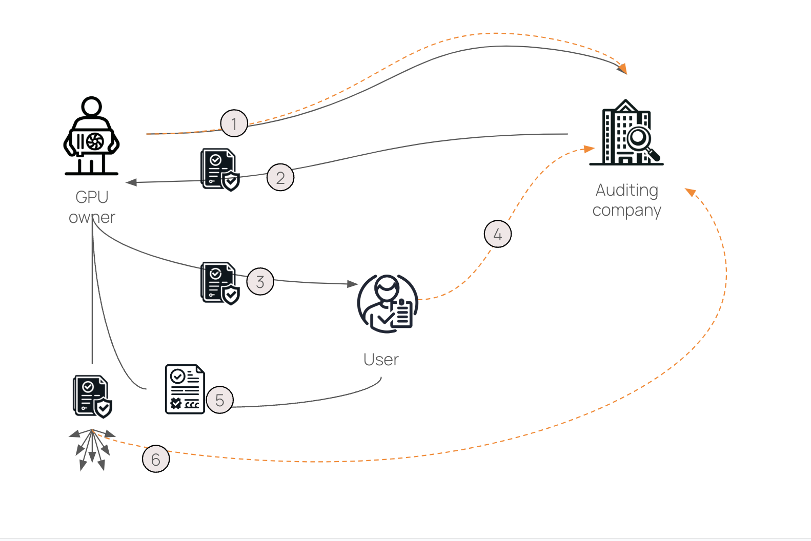 - Auditing company audits GPU owner, checking their exact geo-location. If coming from a centralised cloud provider, this data can be pulled from their APIs.