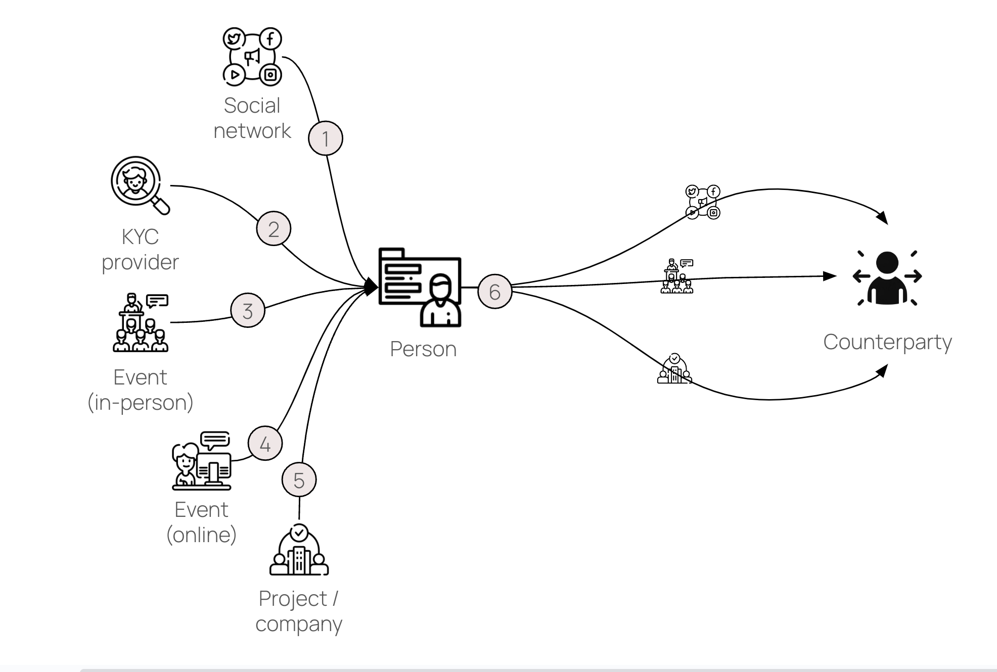 - As required, person can select appropriate handles, credentials and POAPs to establish trust for any interaction. (e.g. they require 3 proof points, type depending on level of assurance needed)
